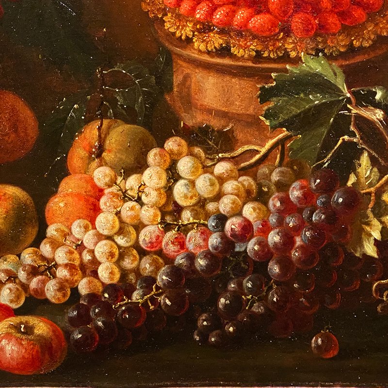 Среди многообразия и великолепия мастерски написанных натюрмортных композиций, первое место занимают цветочно-фруктовые, в которых главным действующим персонажем является виноград: белый, черный, розовый, золотой, спелый, полупрозрачный, светящийся, солнечный, теплый, наполненный будущим вином… Виноградные кисти околдовывают и притягивают взор, соседствуя с другими земными плодами и вселяют уверенность в завтрашнем дне. Не менее впечатляют натюрморты с вином и снедью, которые позволяют современному винолюбу своими глазами увидеть винно-гастрономические сочетания и фудпейринг 500-летней давности. Кстати, многие из представленных работ зритель никогда не видел, поскольку место их постоянного пребывания — запасники.