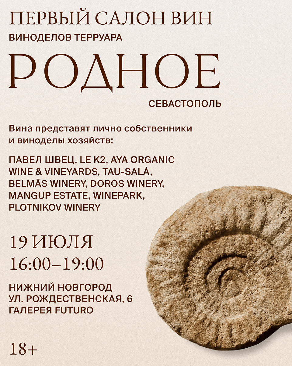 19 июля в Нижнем Новгороде на Рождественской 6 в галерее Futuro состоится первый в России салон вин терруара Родное. Виноделы из Севастопольского региона приедут лично и впервые предстанут перед публикой как единый, полностью органический терруар. В границах Родного находятся 11 небольших винодельческих хозяйств. Все они объединены общими ценностями, и взглядами на виноградарство и виноделие. Все они созданы людьми, для которых лозы, земля и вино это — жизнь, любовь и творчество.